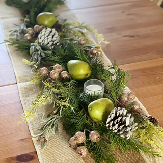 If you don’t have anything green in your yard/neighborhood, trim off the bottom of your fresh Xmas tree, or grab free clippings from a tree farm, or maybe a neighbor‘s trash can 🤷♀️ (Joking….well, kinda..if you see it, grab it!) It can be any kind of “green”. Grocery stores carry cheap greens during the holiday season in the floral department. Wegmans usually always has eucalyptus that is gorgeous and cheap. Instead of pears, try oranges, pomegranates, apples, or piles of cranberries. Or keep it simple with greens only.